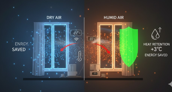 겨울철 실내 습도를 40~60%로 유지하면 공기 순환이 빨라집니다. 수분은 열을 머금는 성질이 있어 따뜻한 공기가 실내에 더 오래 머물게 하며, 체감 온도 또한 올라가 보일러를 덜 돌리게 됩니다.