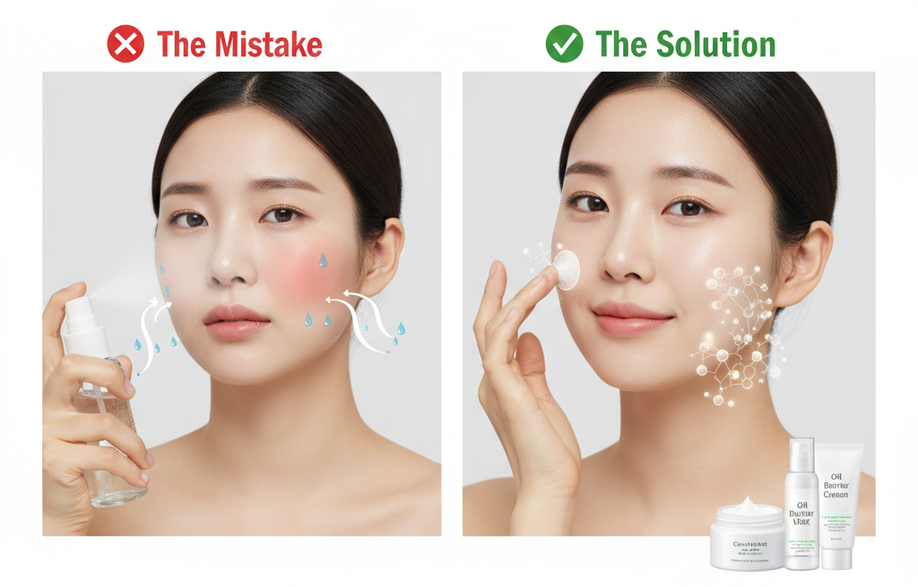 - 워터 미스트의 함정: 물로만 이루어진 미스트는 증발하면서 피부 원래의 수분까지 함께 앗아가는 '증발성 건조'를 일으킵니다.